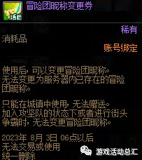 [冒险团昵称变更券]只在15周年庆的奖励中出现过,随后1年时间里没有任何获取途径。