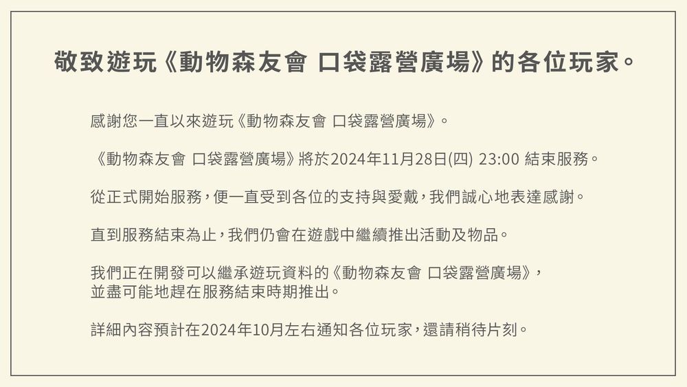 任天堂旗下智慧型手机游戏《动物森友会 口袋露营广场(どうぶつの森 ポケットキャンプ)》(iOS/Android)22日宣布,将在 2024 年 11 月 28 日 23:00(UTC+8)结束服务。官方表示,目前正在开发可以继承储存资料的付费版应用程式,且能继承目前的储存资料。