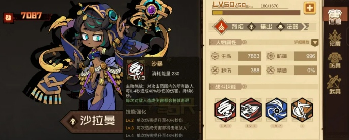 沙拉曼的自动技能“沙暴”为短CD穿透型技能,基础冷却仅7秒。命中多个目标时,每一段穿透伤害均可独立触发天罚之日被动。当目标处于燃烧状态时,该技能伤害进一步提升。其被动“浮游剑”可在队友释放自动技能时概率协同触发,使全队自动技成为沙拉曼输出循环的延伸节点,显著扩大技能覆盖密度。