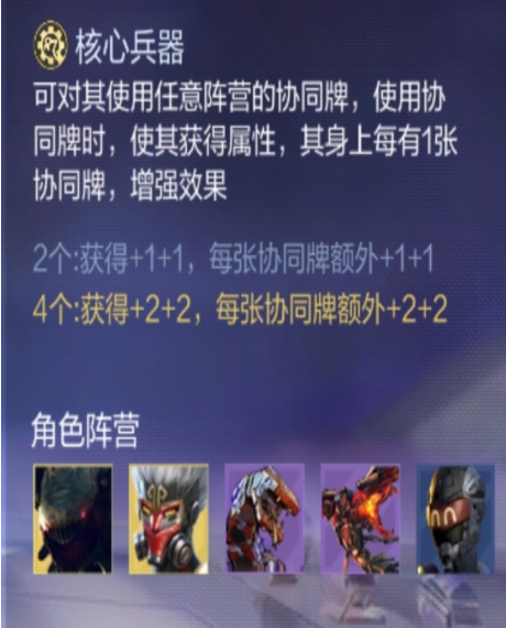 核心兵器阵容的基础机制在于其开放式的协同牌兼容规则——可无门槛使用任意阵容产出的协同牌。每张协同牌均可直接转化为角色属性增益,且增益效果随场上协同牌总数呈阶梯式提升。当己方场上有2张核心兵器角色时,即触发基础+1/+1加成;此后每新增1张协同牌,额外叠加1层对应增幅;若核心兵器角色数量达到4张或以上,全部协同类增益效果将整体翻倍。该机制赋予阵容极强的滚雪球能力,中后期属性成长曲线陡峭。