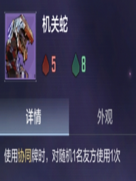 机关蛇具备协同牌双触发特性:对其施放任意协同牌时,除自身生效外,还将随机为一名友方单位同步触发相同效果。在协同牌资源有限阶段,优先分配至机关蛇可最大化单张协同牌的战略价值。