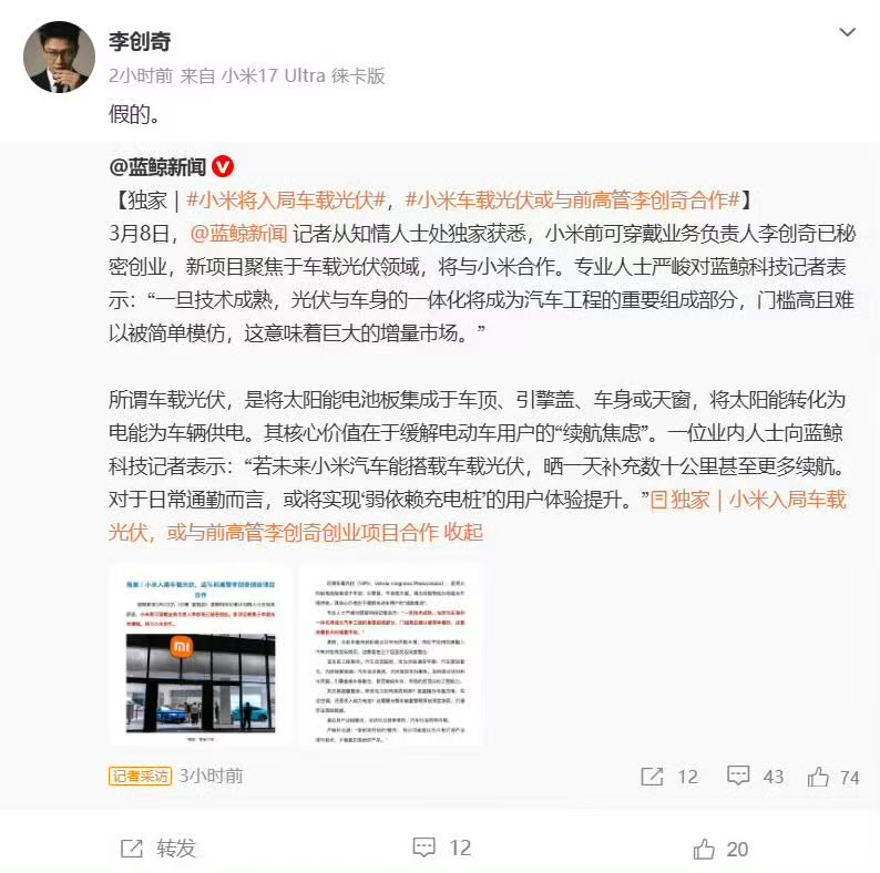 3月8日以来,多家媒体报道,小米前可穿戴业务负责人李创奇已秘密创业,新项目聚焦于车载光伏领域,将与小米合作。