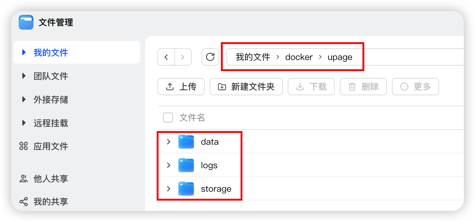 打开飞牛的「文件管理」,在 docker 文件夹下创建 upage 目录。