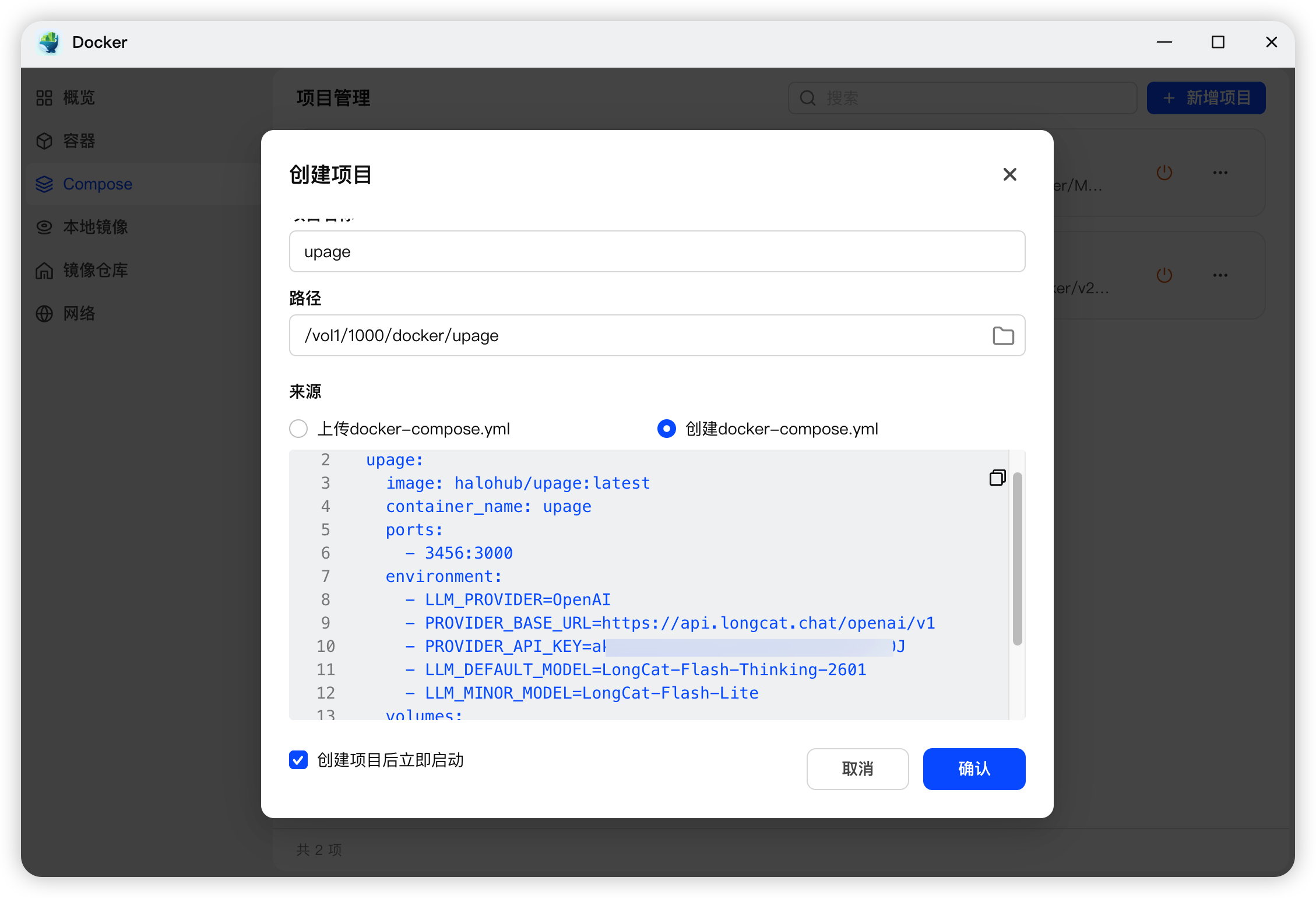 打开「Docker」应用,切换到 Compose 面板,新增项目: