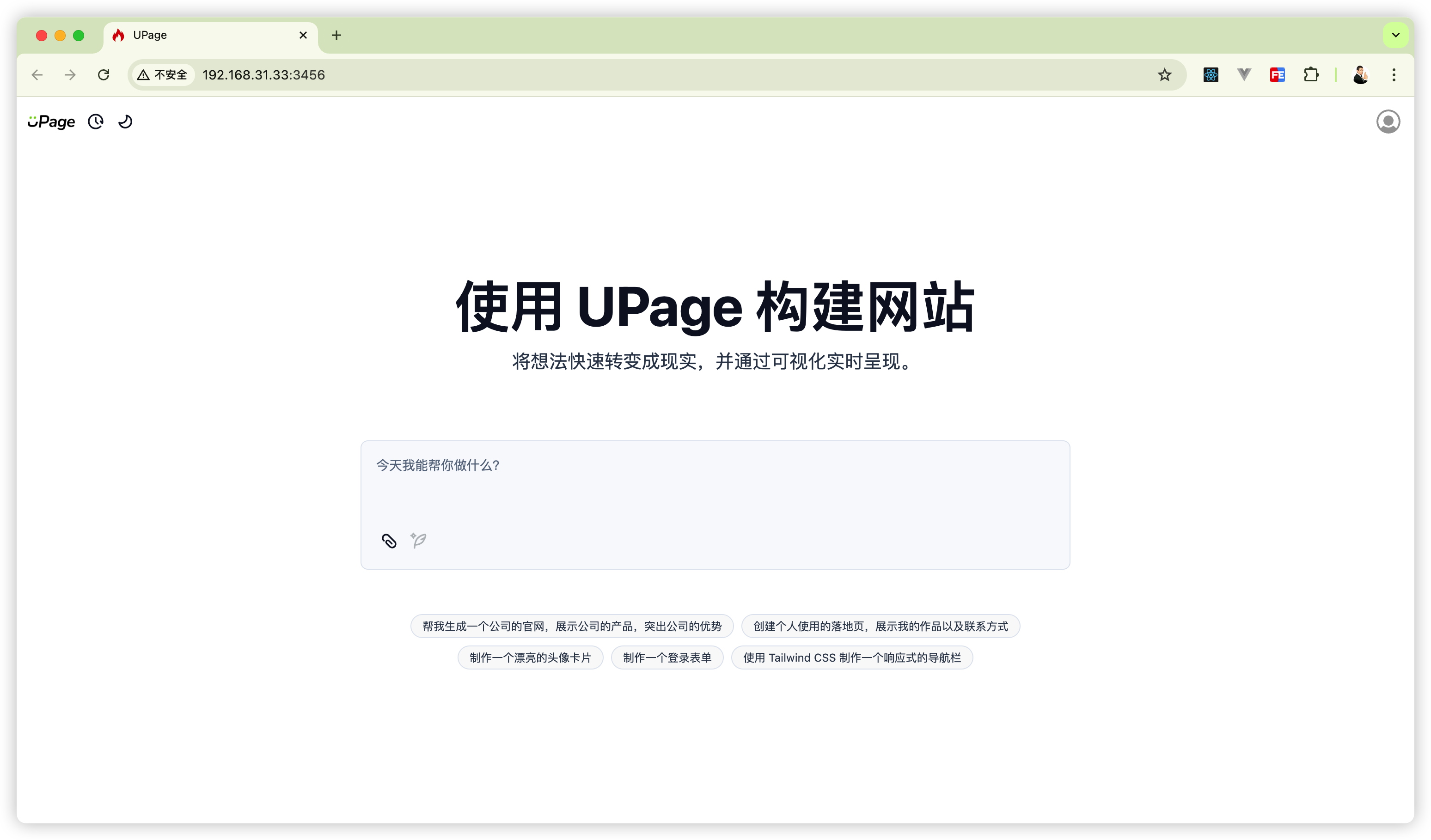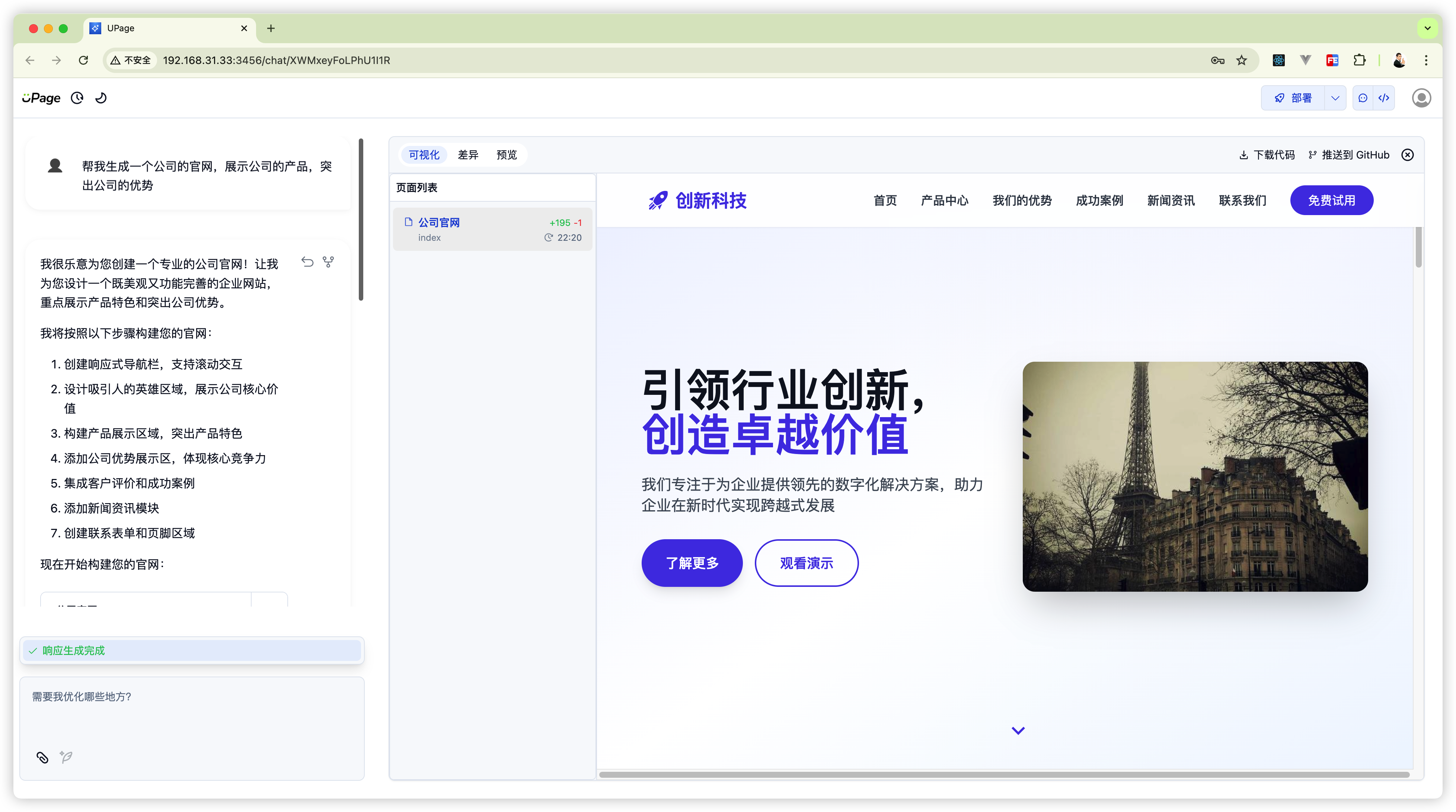 在输入框输入你的需求,Upage 就会帮你做个静态网页出来。