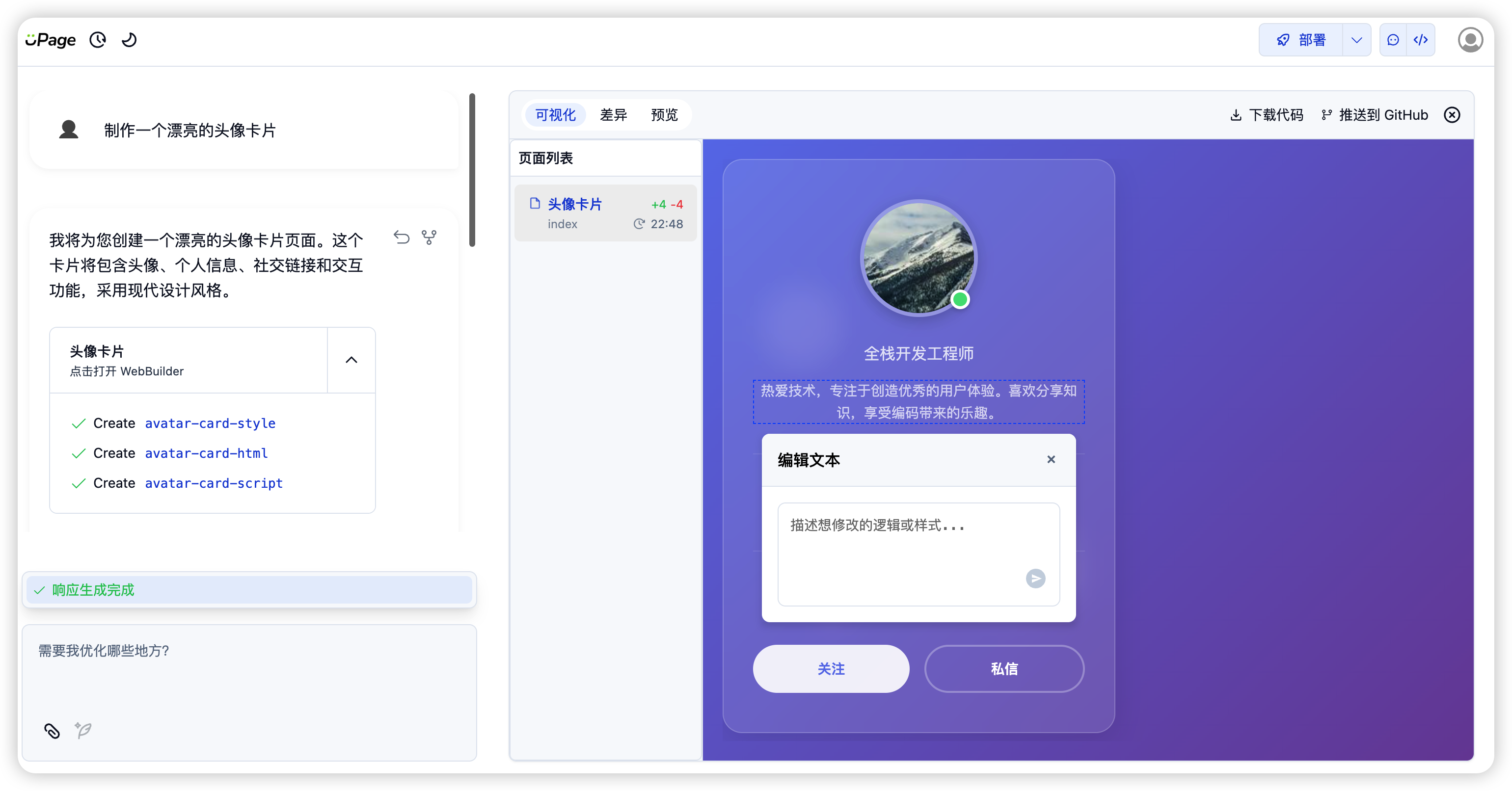 UPage 是一款开源的 AI 生成式网页构建工具。只需输入一段描述,它就能利用大模型能力帮你搓个静态网页出来。