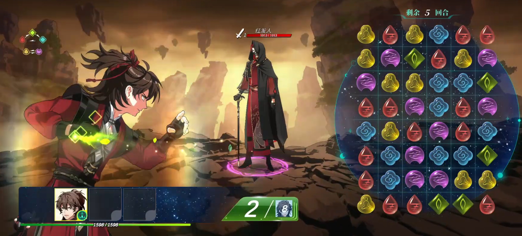 战斗中还嵌套一套色彩克制体系:红、绿、蓝三色构成循环克制链(红克绿、绿克蓝、蓝克红),黄色与紫色互为克制关系。敌方头像边框颜色即代表其属性类型,玩家需匹配对应克制色灵珠进行消除,方可触发全额伤害加成;若误选被克制色,则本次输出大幅衰减。配合有限的回合数限制,整套机制对资源分配、路径预判及属性识别能力提出明确要求,形成兼具观赏性与策略深度的对抗体验。