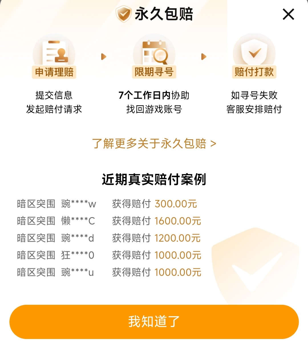 安全性是账号交易的核心关切。针对《原神》等高价值游戏账号,全面推行【永久包赔】保障机制——该服务覆盖所有经平台认证的售出账号,一旦发生卖家恶意找回、异常冻结等情形,买家可依据平台规则申请赔付。区别于多数平台仅聚焦交易达成环节,将服务延伸至交付后全周期,其账号详情页实时滚动展示近期成功赔付案例,切实增强买家决策信心,也进一步推动优质账号的流通与溢价空间。