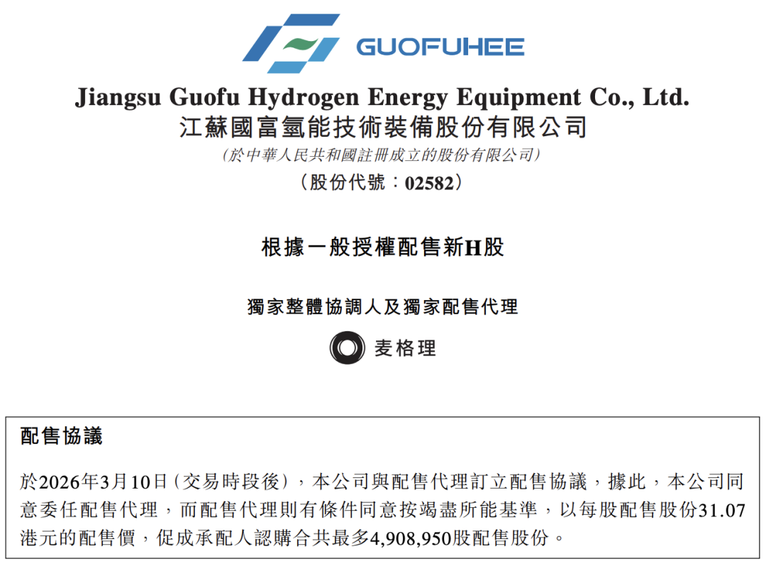 3月11日,国富氢能发布公告,于2026年3月10日,公司与配售代理订立配售协议,公司同意委任配售代理以每股配售股份31.07港元的配售价,促成承配人认购合共最多490.895万股配售股份。配售股份数目分别占经根据配售事项发行的配售股份所扩大的已发行H股总数及已发行股份总数约4.84%及3.88%。配售价较于配售协议日期在联交所所报每股股份收市价35.42港元折让约12.28%。