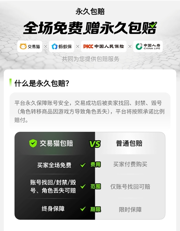 值得一提的是,是当前行业中唯一承诺全场永久包赔的交易平台。交易完成后,如遇账号被原号主恶意找回、因卖方违规行为(如开挂、代充黑产)导致封禁等不可控情形,用户可在规定时效内提交凭证申请赔付。经客服团队核实无误后,平台将按订单金额100%执行赔偿,切实降低玩家交易风险。