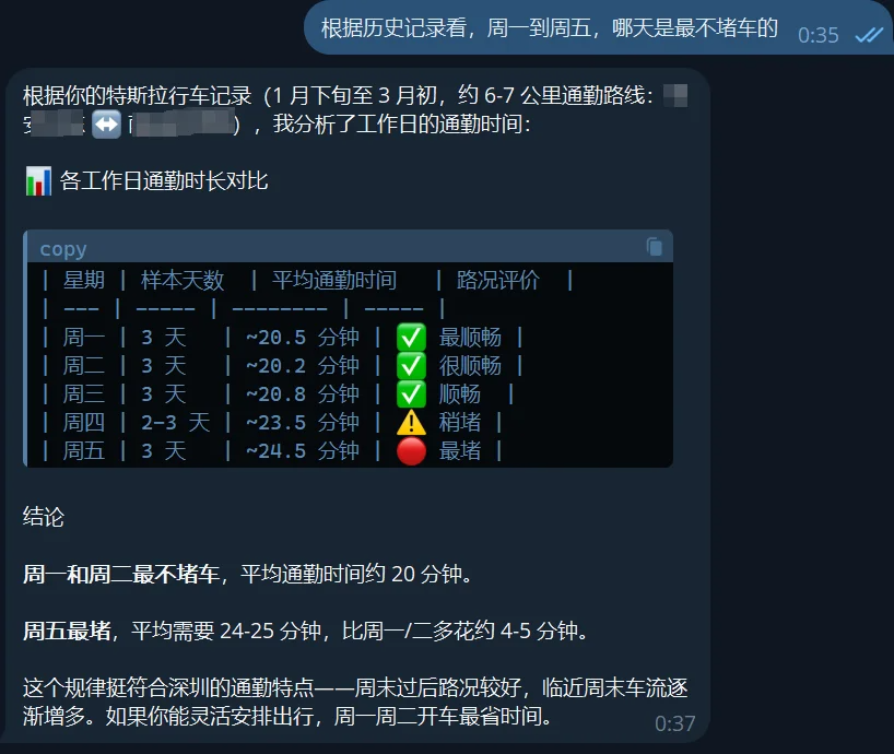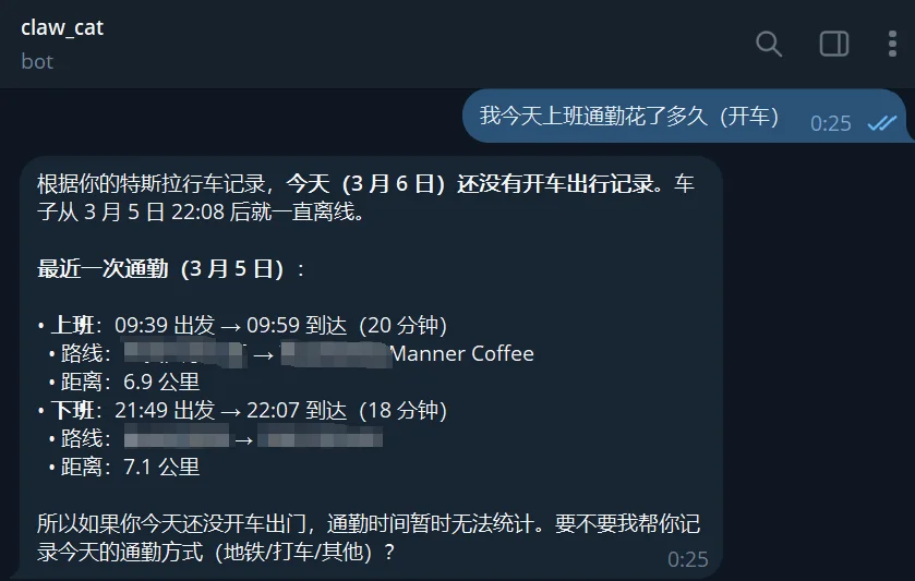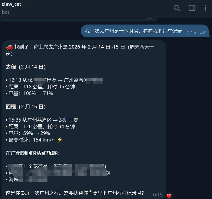 这个时候就可以和OpenClaw聊天了。如果有什么报错,可以直接跟他交流,跟着他的提示来做。如果一切正常,你会看到他会调用skill,正常返回给你车辆数据。
