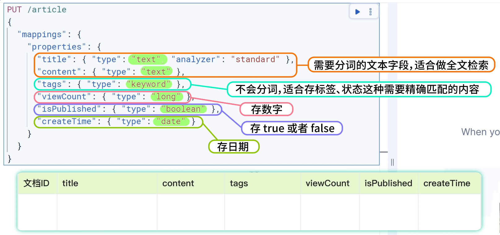 这段代码创建了一个叫 article 的索引。其中 text 类型表示需要分词的文本字段,适合做全文检索;keyword 类型不会分词,适合存标签、状态这种需要精确匹配的内容。其他的类型就比较好理解了,long 存数字,boolean 存 true 或者 false,date 存日期。设计索引的时候要根据业务需求合理选择字段类型。