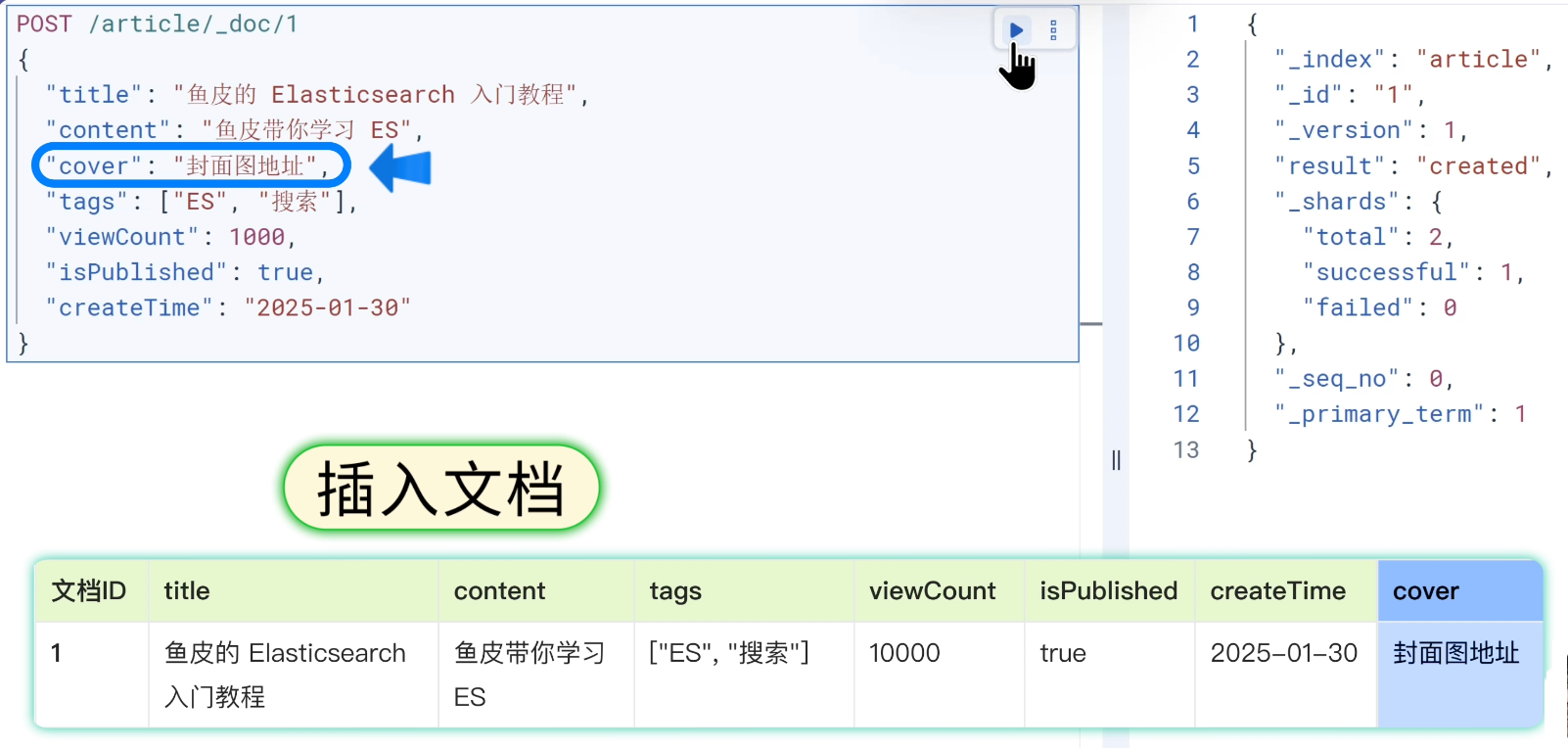 2)然后是 插入文档。文档(Document) 相当于 MySQL 里的一行数据。ES 的文档是用 JSON 格式存储的,不需要像 MySQL 那样提前定义好所有字段,而是随时可以加新字段,非常灵活。