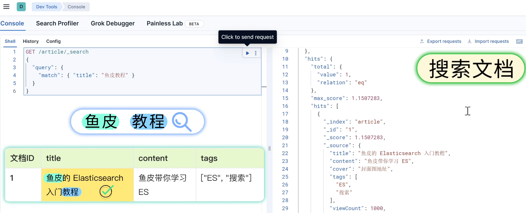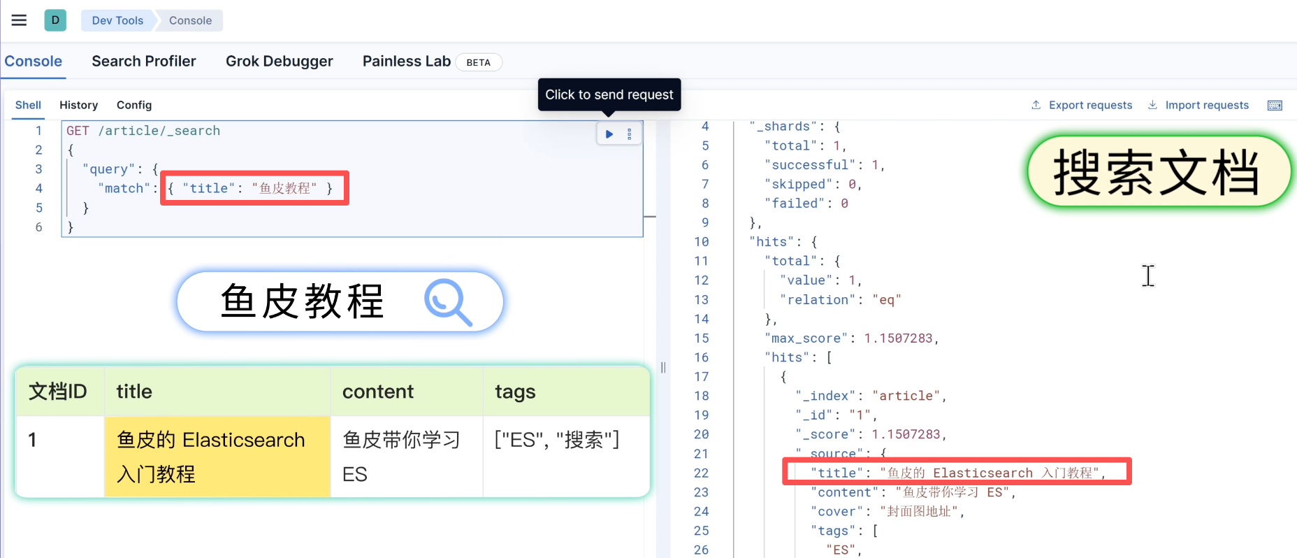 3)有了数据之后,就可以体验 ES 最核心的能力 搜索文档。比如在 article 索引中搜索标题包含 "鱼皮教程" 的文章: