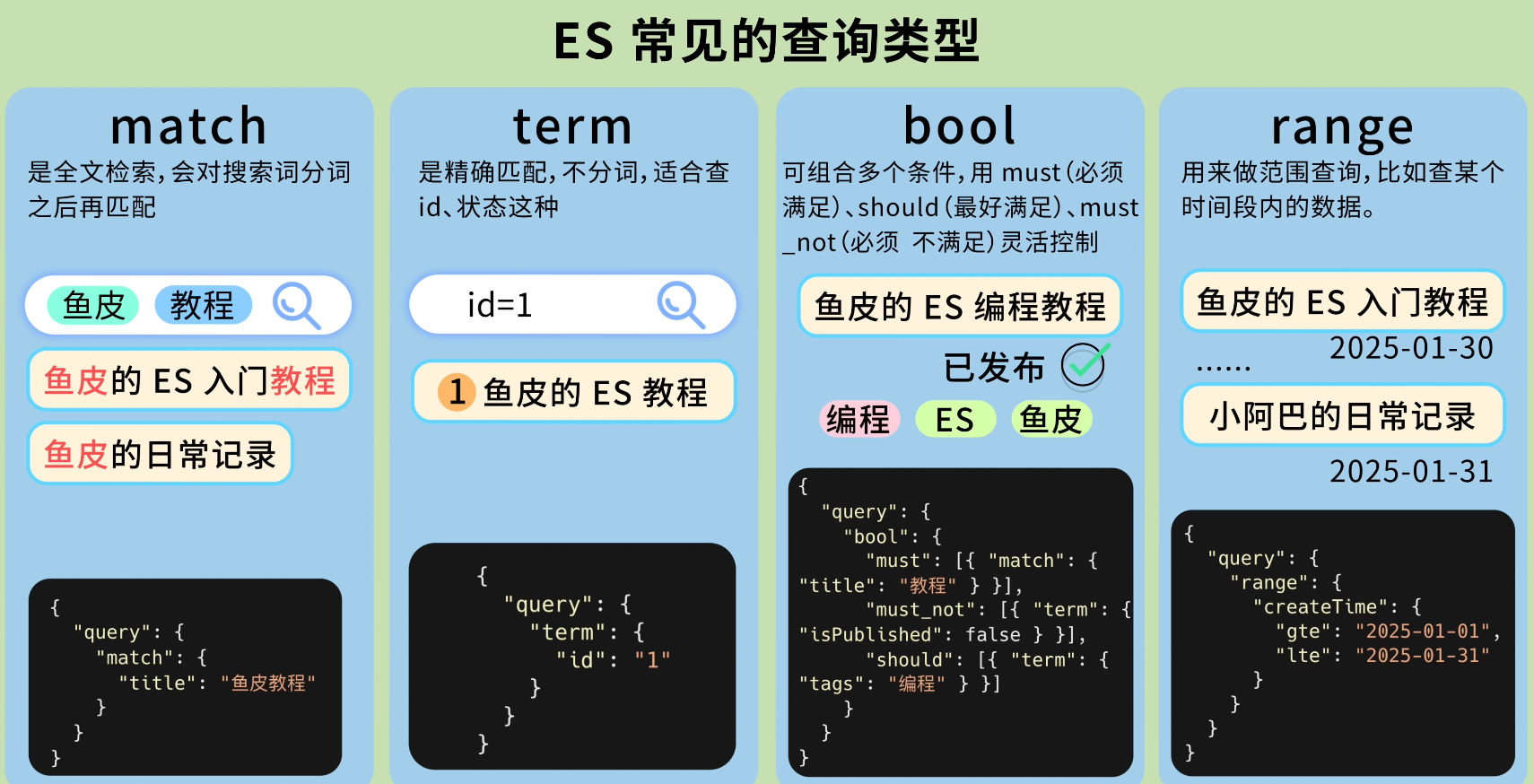 match 是全文检索,会对搜索词分词之后再匹配term 是精确匹配,不分词,适合查 id、状态这种bool 可以组合多个条件,用 must(必须满足)、should(最好满足)、must_not(必须不满足)来灵活控制range 用来做范围查询,比如查某个时间段内的数据。