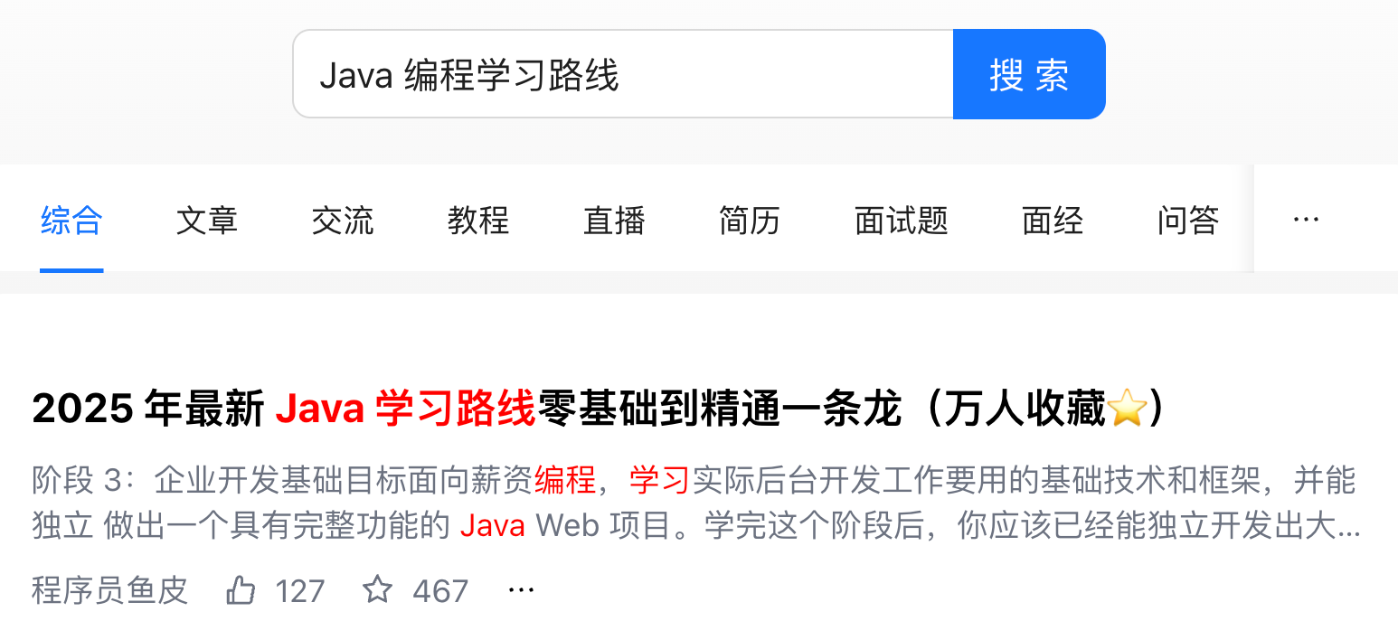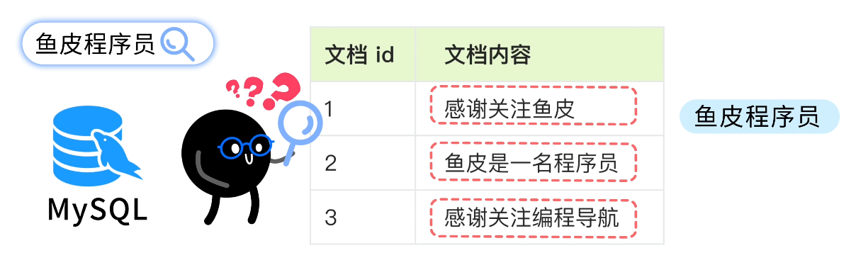 这种结构下,如果用户搜 “鱼皮程序员”,MySQL 会傻乎乎地把它当成一整个词去匹配,结果可能啥也搜不到。