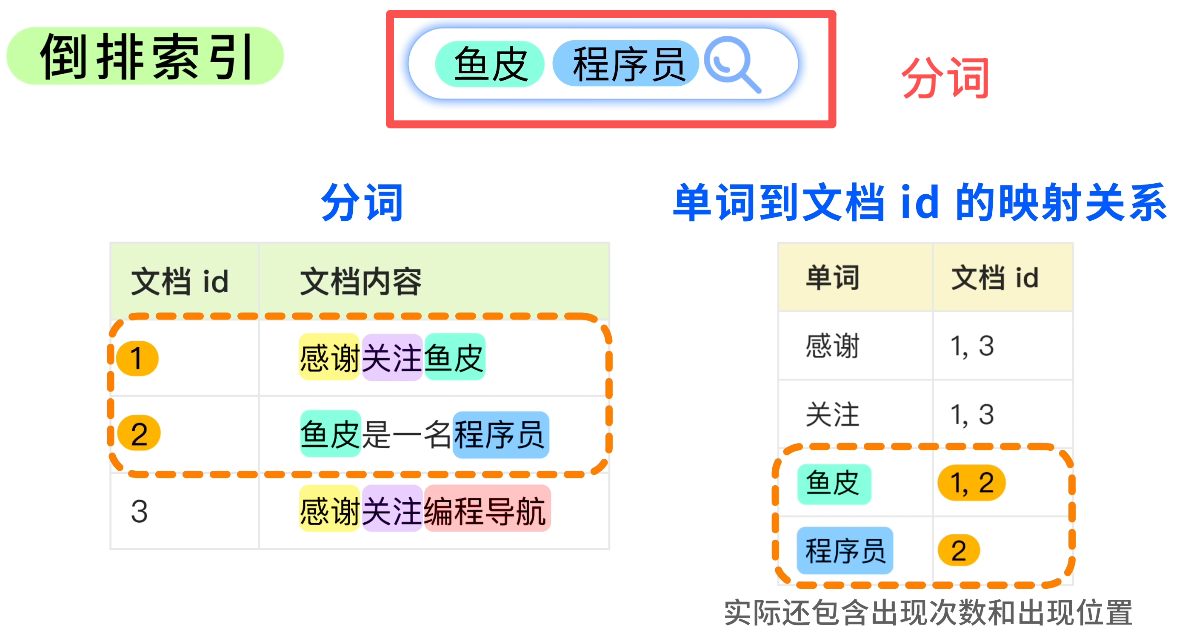 有了上述的倒排索引,当用户搜索 “鱼皮程序员” 时,搜索引擎数据库会先对搜索词进行分词,得到 “鱼皮” 和 “程序员”,然后根据这两个词汇就能找到文档 id 1、2 了。不用再一行一行遍历表内所有的数据,实现了更灵活、快速的 模糊搜索 。