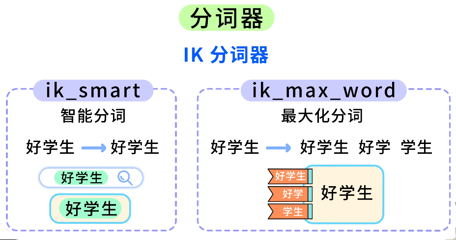 ik_smart 是智能分词,尽量把词分得少一点,比如 "好学生" 就只会拆成 "好学生" 一个词ik_max_word 是最大化分词,能拆的都拆,"好学生" 会被拆成 "好学生"、"好学"、"学生" 三个词。
