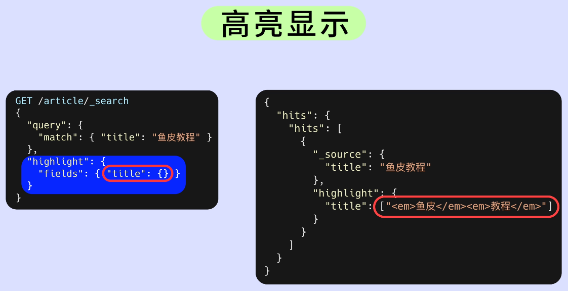 鱼皮:当然可以,ES 支持 高亮显示 功能。只需要在查询里加个 highlight 参数,指定要高亮的字段就行:
