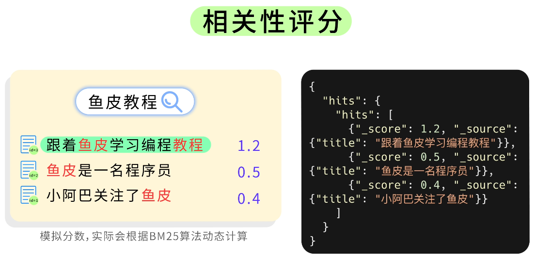 鱼皮:好问题。ES 会给每个搜索结果计算一个分数,放到 _score 字段中,分数高的排在前面。