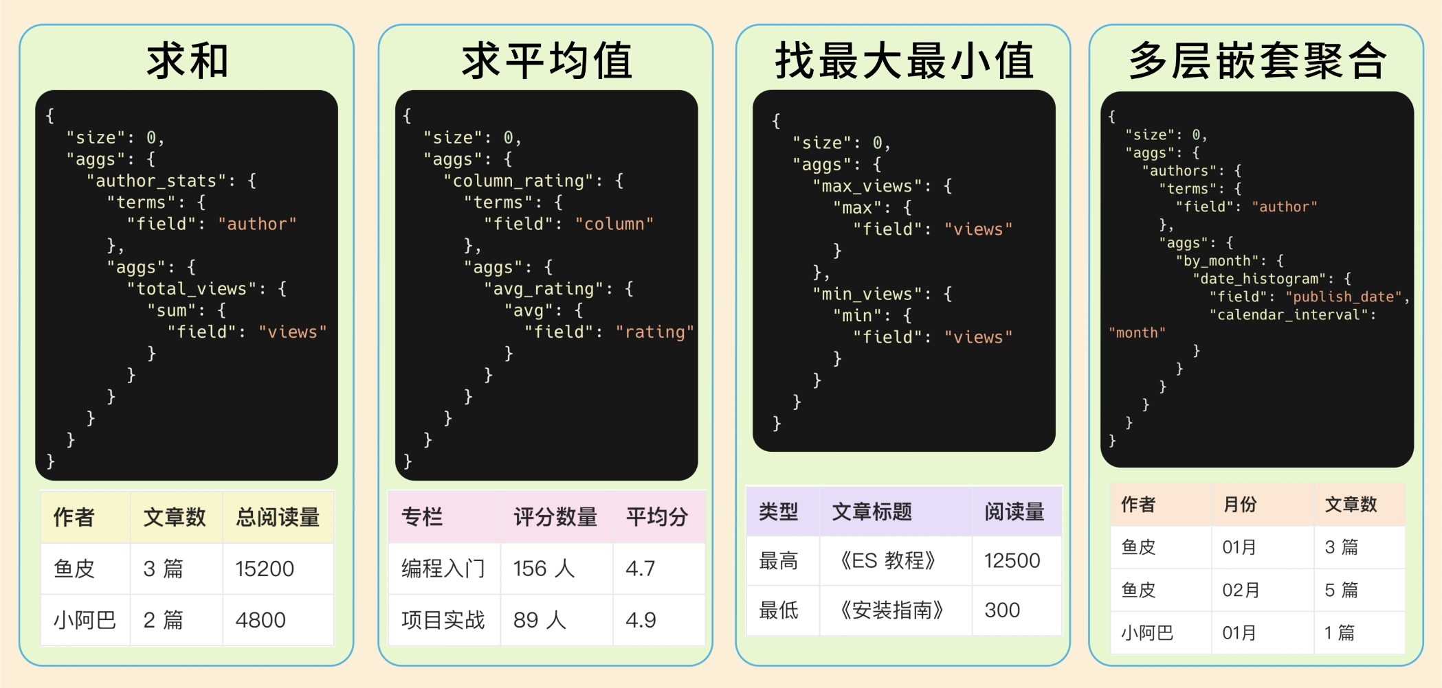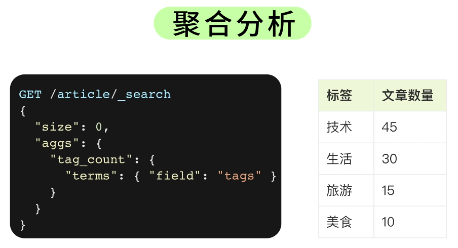 除了分组统计数量,ES 的聚合还能做求和、求平均值、找最大最小值、甚至多层嵌套聚合,能够满足开发各类数据报表的需求。