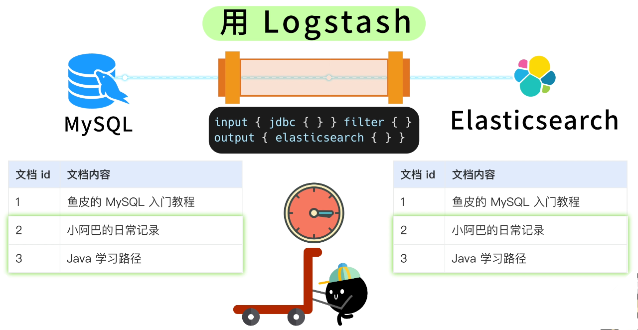 它是 ES 官方提供的数据收集工具,可以配置从 MySQL 定时拉取数据同步到 ES。优点是不用写代码,全靠配置驱动,缺点是需要额外部署组件,灵活性也有限。