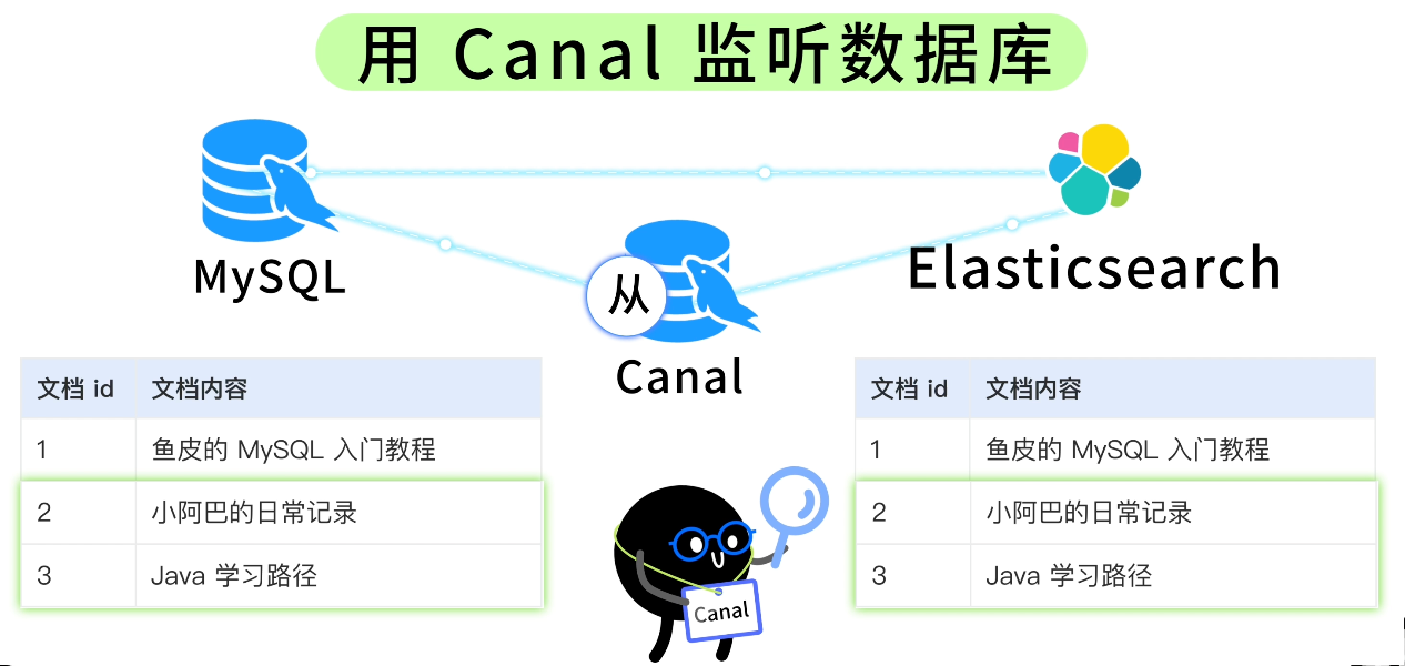 Canal 是阿里开源的一个工具,它会伪装成 MySQL 的从库,实时数据库的变更日志。数据库一有改动,Canal 立刻就能感知到,然后同步到 ES。优点是能做到实时同步,缺点是部署和运维相对麻烦一点。
