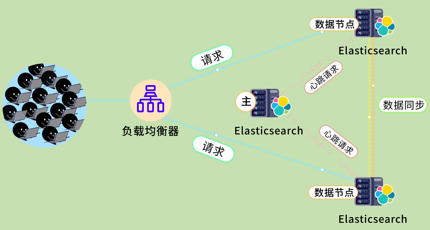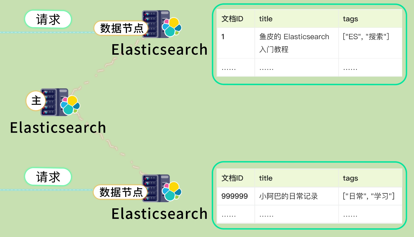 ES 集群中有几种角色的节点。主节点 负责管理集群的状态,比如哪些节点在线、索引的元数据等等。数据节点 负责存储实际的数据,处理读写请求。一般生产环境至少部署 3 个节点,保证高可用。