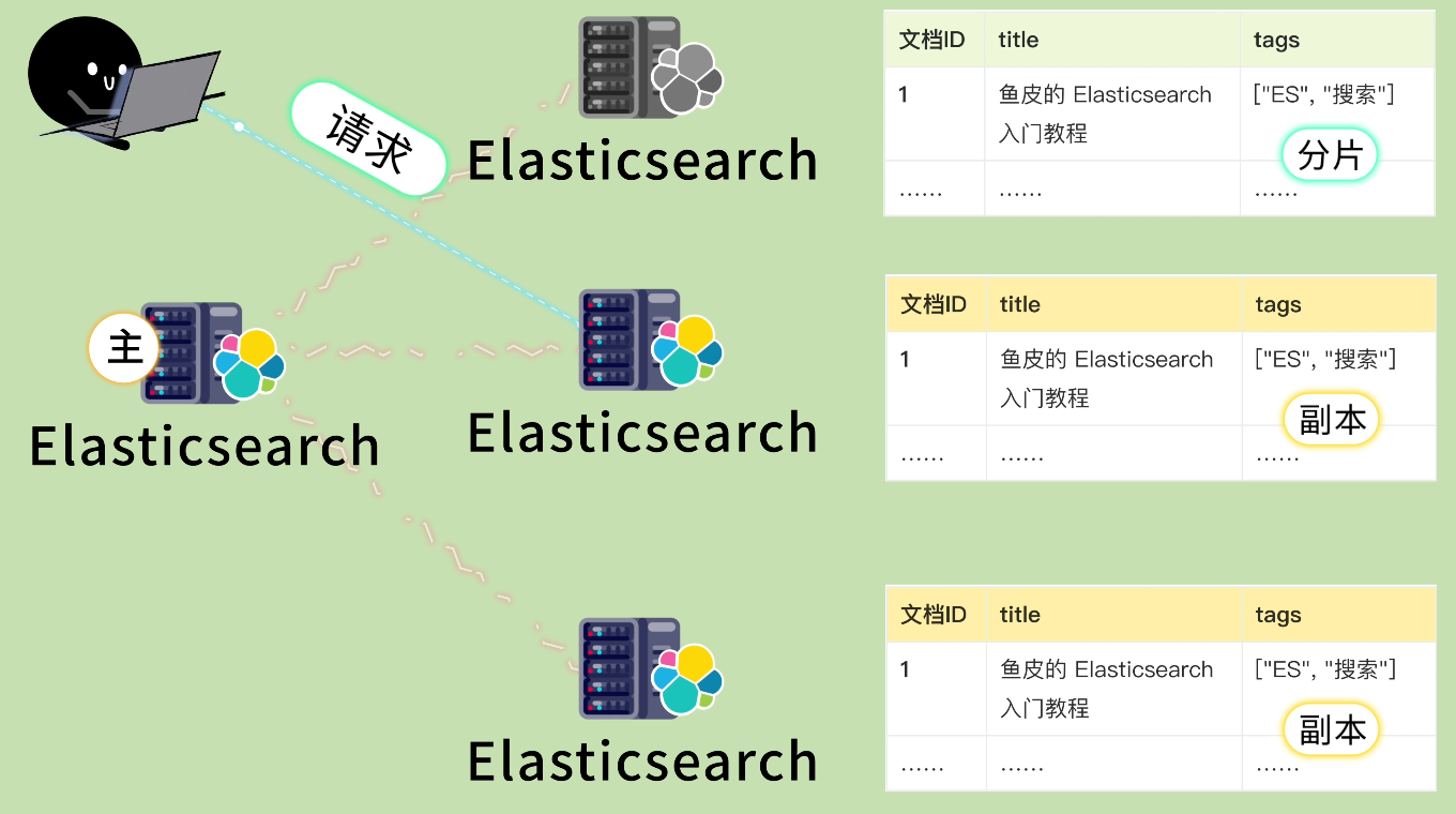 阿坤用看流浪狗的眼神看了你一眼,回答道:这就要说到 分片 了。分片就是把一个索引的数据拆成多份,分别存到不同的节点上。这样单个节点存不下的海量数据,也能通过多节点分担。而且多个节点可以并行处理查询请求,性能也更好。