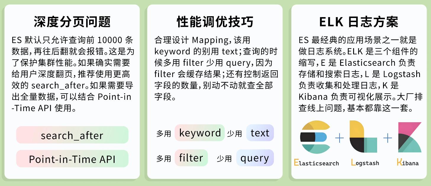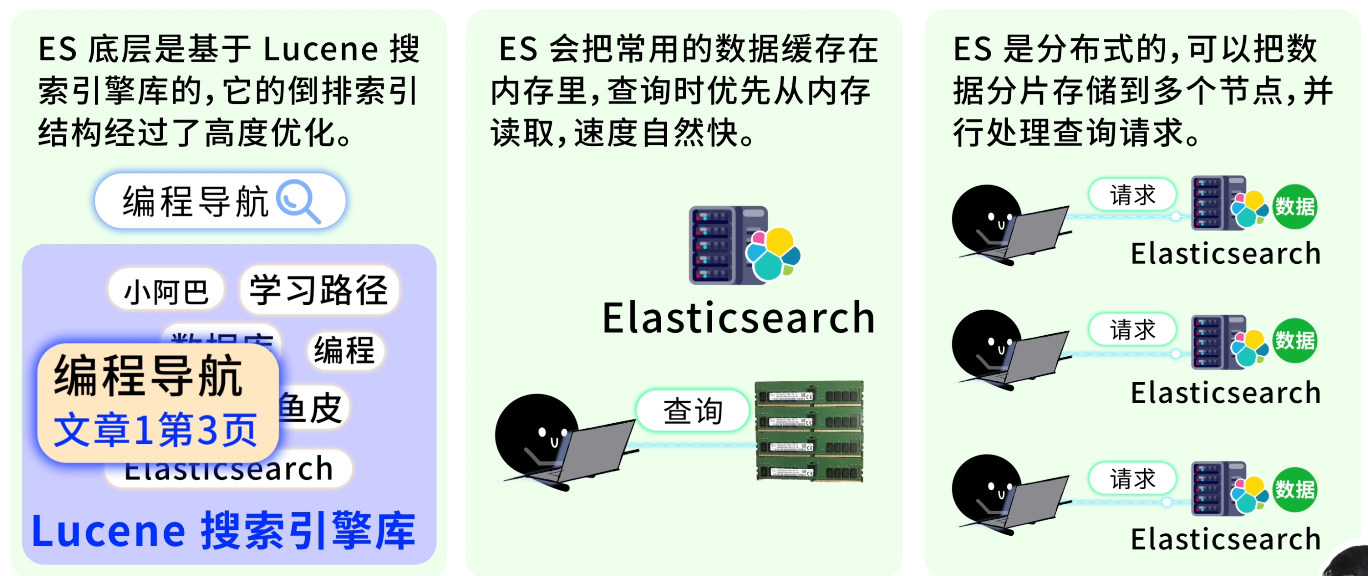 鱼皮:没错,但这只是一方面。ES 底层是基于 Lucene 搜索引擎库的,它的倒排索引结构经过了高度优化。另外 ES 会把常用的数据缓存在内存里,查询时优先从内存读取,速度自然快。再加上 ES 是分布式的,可以把数据分片存储到多个节点,并行处理查询请求,几方面加起来,性能就上去了。