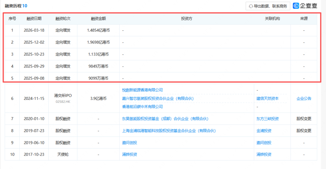 据了解,自港交所IPO后,国富氢能已完成5次定向增发融资,累计融资金额6.483亿港币。