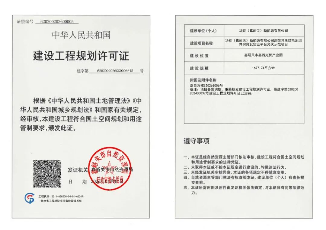 3月17日,嘉峪关市自然资源局《华能(嘉峪关)新能源有限公司高效异质结电池组件30兆瓦实证平台光伏示范项目》批后公布,该项目建设规模 1677.74㎡,建设地点位于嘉西光伏产业园。