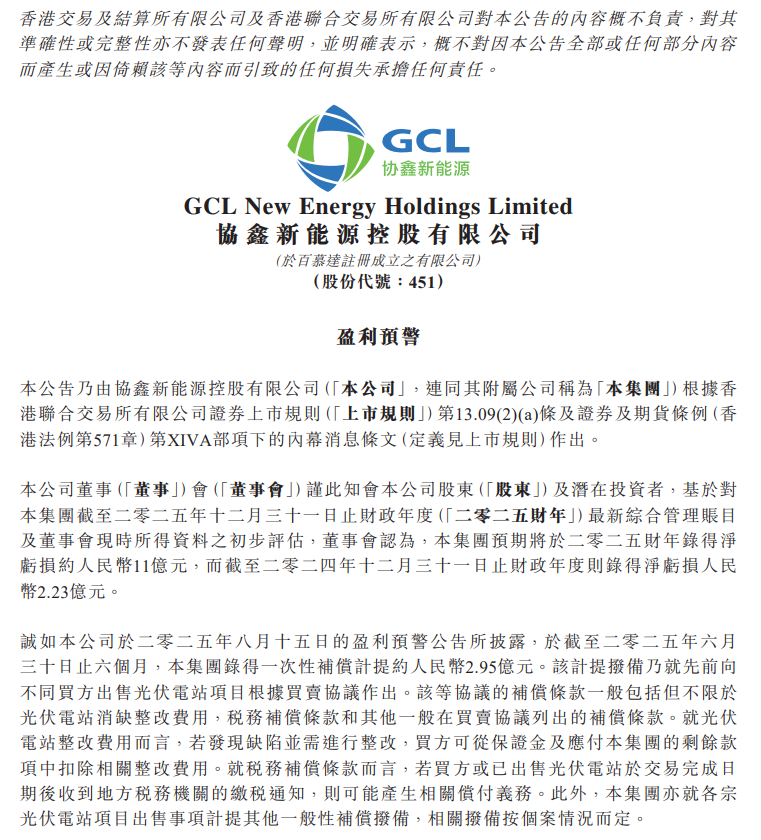 3月15日,协鑫新能源发布盈利预警公告称,集团预计将在2025财年录得净亏损约11亿元,而截至2024年12月31日止财年则录得净亏损2.23亿元。本公司董事会基于对最新综合管理账目的初步评估,指出此次亏损主要是由于补偿计提的增加。