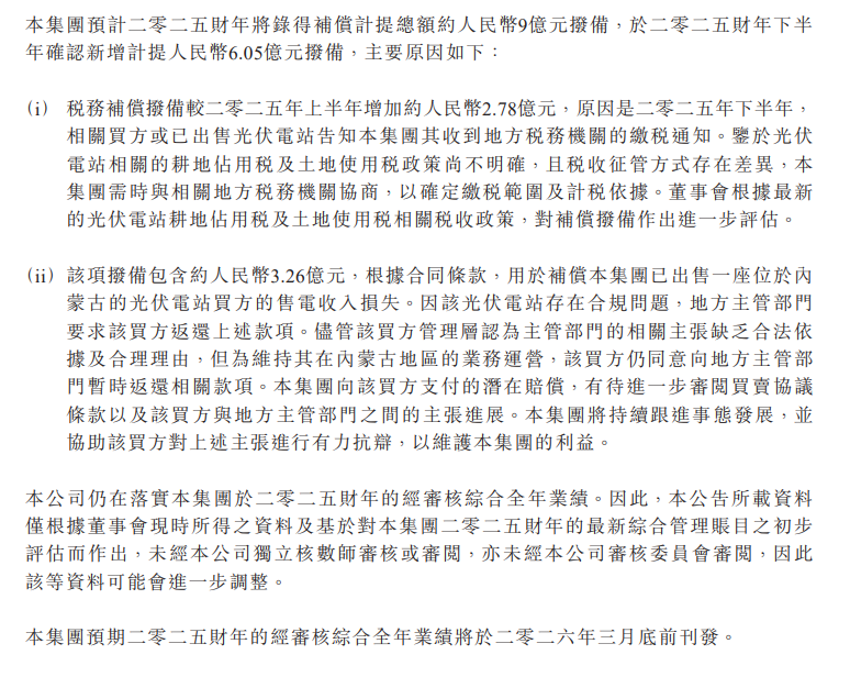 公告中提到,本集团预计将在2025财年录得补偿计提总额约9亿元,预计在下半年确认新增计提6.05亿元。具体原因包括税务补偿拨备增加约2.78亿元,因相关买方收到地方税务机关的缴税通知。此外,补偿拨备中包含约3.26亿元,用于补偿已出售光伏电站买方的售电收入损失。该光伏电站因合规问题,地方主管部门要求买方返还款项。