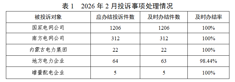 能源企业应在2026年2月份办结投诉1609件(含上月结转),及时办结1608件,及时办结率99.94%(详见表1)。