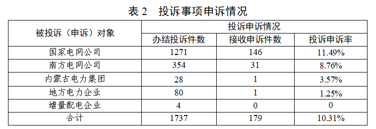 2026年2月,办结投诉事项1737件(含上月结转),热线平台接收申诉事项179件,投诉申诉率10.31%。从申诉内容看,主要集中在用电保装、电表计量、线路安全等方面(详见图2)。其中,涉及国家电网公司146件、南方电网公司31件、内蒙古电力集团1件、地方电力企业1件(详见表2)。