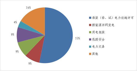 2026年2月,热线平台接收举报问题线索79件。其中,承装(修、试)电力设施许可42件、新能源并网发电7件、用电保装7件、线路安全7件、电力交易3件、其他13件(详见图3)。举报数量较多的省份为:广东11件、浙江6件、河北5件、陕西5件、湖南4件。