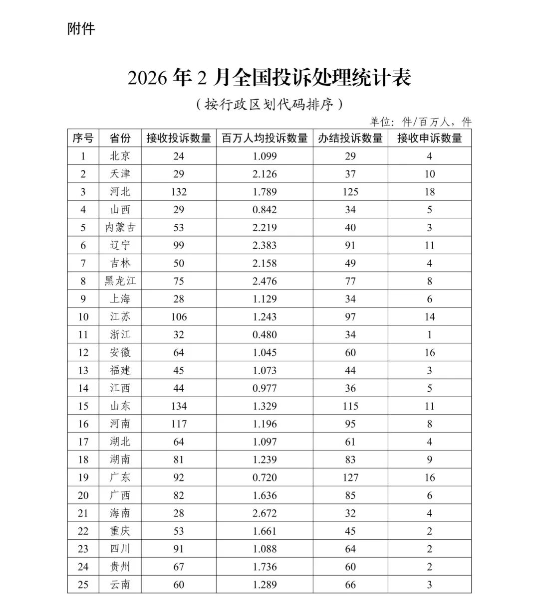 附件:2026年2月全国投诉处理统计表