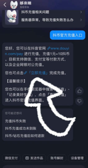 5. 在对话窗口输入"抖音官方充值入口"关键词,按指引完成充值操作。