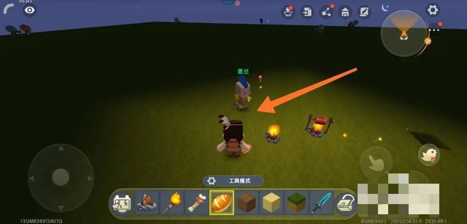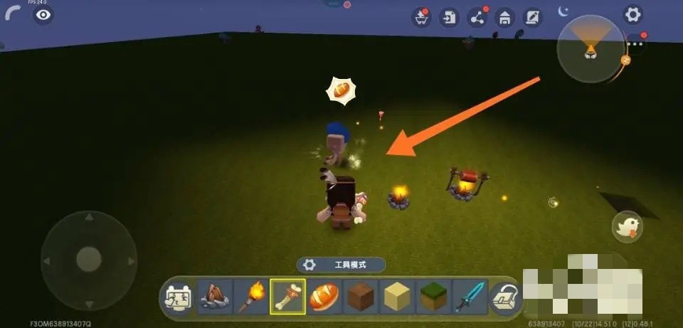 进入游戏以后,先把篝火放在地上,然后使用火把点着,然后把生肉放在篝火上烤。