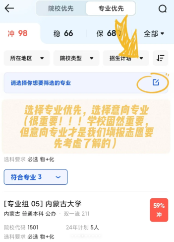 第三步:选择专业优先模式,慎重填写意向专业。这一步至关重要,将直接影响院校筛选结果和未来就业方向。