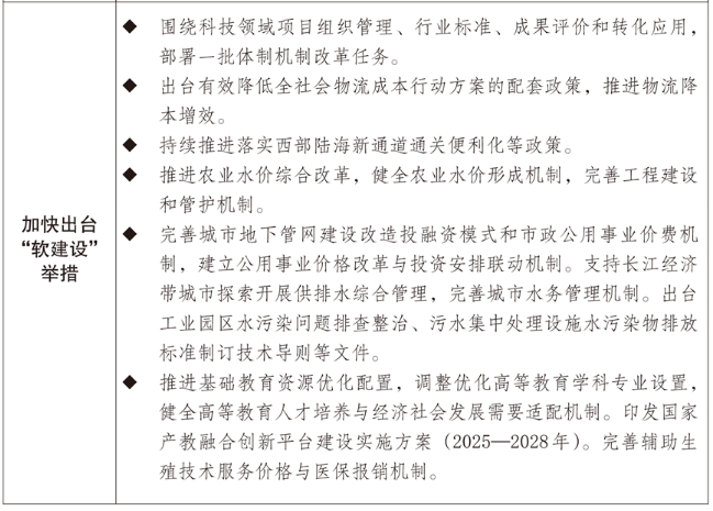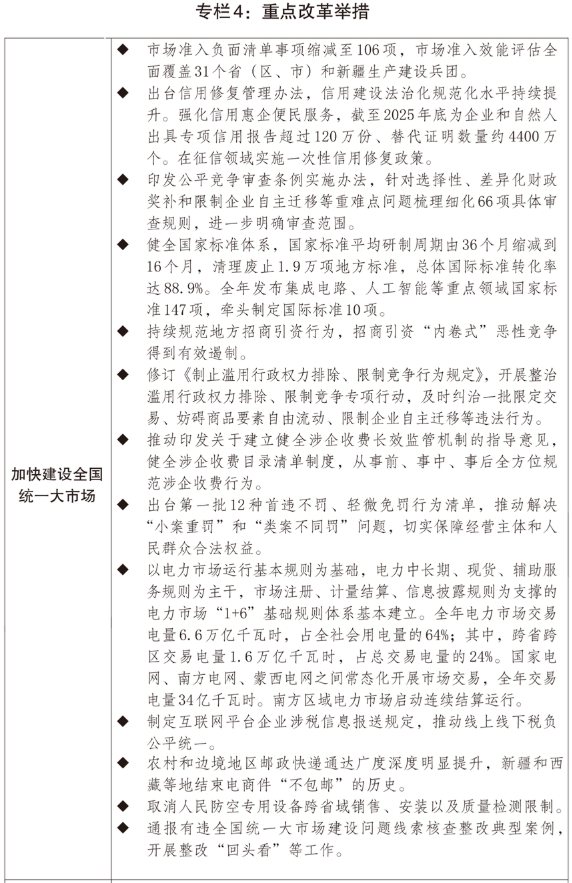 一是全国统一大市场建设向纵深推进。实施全国统一大市场建设指引,出台市场准入负面清单(2025年版),清单事项缩减至106项。深入开展市场准入壁垒清理整治行动,累计修订或废止相关文件2300余件。加快建设统一开放的交通运输市场,实施交通物流降本提质增效行动计划,市场设施联通更加高效顺畅。推动修订反不正当竞争法,出台公平竞争审查条例实施办法,开展整治滥用行政权力排除、限制竞争专项行动。持续规范地方招商引资行为,招商引资乱象得到有效遏制,地方制定实施正策的合规意识明显增强。出台健全社会信用体系的意见,构建信用修复制度,建立企业信用状况综合评价体系,全面推行以专项信用报告替代有无违法违规记录证明。全国统一电力市场体系初步建立,跨电网经营区常态化电力交易机制基本建立,电力现货市场基本覆盖全国。