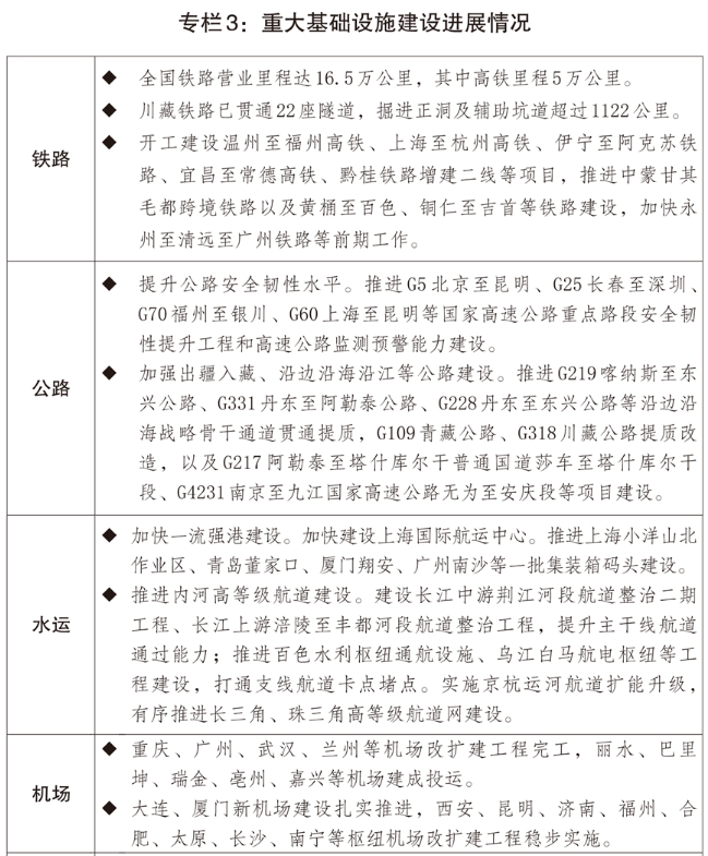 二是深入推进区域联动发展。推进跨区域跨流域大通道建设,加快晋冀鲁豫大宗商品骨干流通走廊建设,推动西部陆海新通道与长江黄金水道、中欧班列协同发展,深入实施东数西算、西电东送、西气东输、北气南下、川气东送等工程,推进沿海、沿江高铁建设,加强京津冀、长三角、粤港澳大湾区、成渝世界级机场群跨区域合作,优化港口布局功能。加强长江中游等重点城市群协调联动发展,促进区域创新链产业链高效协作,支持中西部地区更好承接产业转移。高质量建设国家级新区、沿边临港产业园区、产业协作园区等跨区域产业协作平台。发挥跨区域联结型地区支撑带动作用,分类推动省际毗邻地区合作发展。探索统计分算、利益共享等合作模式,支持区域间通过委托管理、投资合作等多种形式建设合作园区,因地制宜拓展流域经济等模式。