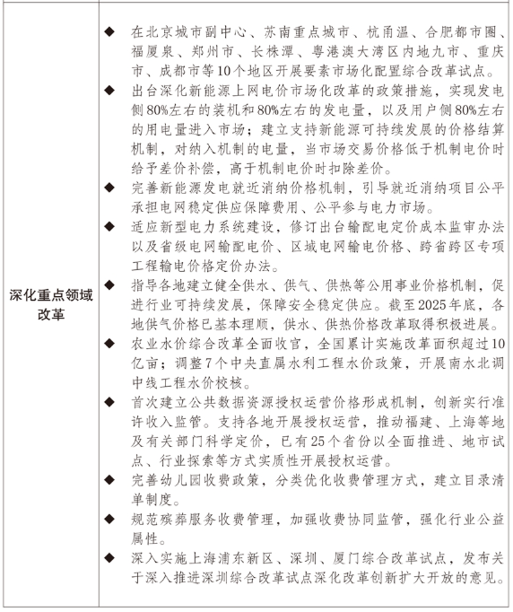 四是重点领域改革取得新突破。在10个地区开展要素市场化配置综合改革试点。深化资本市场改革,提高长期资金权益类投资比例和规模,在科创板推出设置科创成长层等“1+6”改革举措。完善数据产权、流通交易、安全治理等制度,建立公共数据资源登记、授权运营和价格形成正策机制,支持10个地区开展数据要素综合试验区建设。深化新能源上网电价市场化改革,推动新能源上网电量全部进入电力市场、上网电价全面由市场形成。完善新能源发电就近消纳价格机制,促进绿电直连等绿色电力直接供应模式发展。修订输配电成本监审和定价办法。健全省内天然气管道运输价格机制,促进“全国一张网”建设。开展成品油管道运输、第四监管周期输配电定价成本监审。深化公用事业价格改革,推动重大水利工程水价改革,农业水价综合改革全面收官。完善教育、托育、殡葬等公共服务价格正策。发布治理价格无序竞争维护良好市场价格秩序的公告,规范企业价格竞争行为。