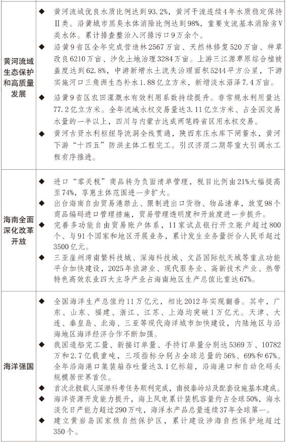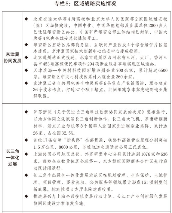 一是区域发展协调性不断增强。三大动力源地区引领带动作用巩固提升,北京非首都功能疏解项目分批压茬推进,雄安新区当年完成投资2116亿元,北京城市副中心综合承载力不断增强,支持天津滨海新区提升先进制造研发转化能力等55条正策措施落地见效,京津冀交通、生态、科技创新、产业等领域协同发展水平持续提升;上海建设国际经济、金融、贸易、航运、科技创新“五个中心”的一批首创性改革、引领性开放措施落地实施,长三角生态绿色一体化发展示范区在科研平台建设等方面获得新一轮改革授权,跨省域医联体医师便利执业等一体化制度创新经验发布推广;“深圳-香港-广州”集群首次跃居全球创新集群首位,横琴合作区第二阶段建设44项正策举措出台实施,前海、南沙、河套开发建设实现新突破。四大板块发展均衡性稳步增强,推进西部大开发形成大保护、大开放、高质量发展的新格局,在云南瑞丽、广西钦防等沿边地区设立产业协作园区,特色优势产业加快集聚;东北全面振兴深入推进,维护国家国防、粮食、生态、能源、产业“五大安全”的能力不断增强;中部崛起战略实施取得积极成效,全国重要粮食生产基地、能源原材料基地、现代装备制造及高技术产业基地和综合交通运输枢纽“三基地一枢纽”战略定位不断夯实;东部地区现代化加快推进,福建全方位推动高质量发展取得新成效,平潭综合实验区、济南新旧动能转换起步区建设扎实推进。长江、黄河两条绿色发展带建设深入推进,长江大保护三年行动计划取得良好开局,生活污水管网补短板、工业园区水污染整治、沿江1公里化工腾退地块土壤污染治理等专项行动加快实施,长江十年禁渔成效不断巩固;黄河干支流堤防加固、排污口排查整治、城镇污水处理能力提升等工作扎实推进,钢铁、化工等重点行业用水效率持续提升。海南自由贸易港正式启动全岛封关运作,实施“一线”放开、“二线”管住、岛内自由的进出口管理制度。海洋强国建设走深走实,全年海洋生产总值约11万亿元,海洋水产品产量、船舶与海洋工程装备市场份额、海运量、海上风电累计装机规模等稳居全球首位,近岸海域水质优良比例达84.9%。