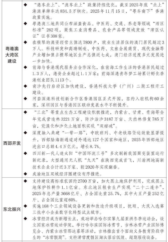 一是深化实施区域战略。稳妥有序推进北京非首都功能疏解项目落地,加快建设现代化首都都市圈,推动形成更加紧密的京津冀协同发展格局,增强雄安新区内生发展动力和人气活力。以上海“五个中心”建设为牵引,发挥苏浙皖比较优势,协同强化长三角地区全球资源配置能力,进一步推动长三角生态绿色一体化发展示范区功能升级,支持上海与苏州推进重点领域同城化发展。持续深化粤港澳规则衔接、机制对接,有序推进职业资格互认、数据跨境流动等,发挥横琴、前海、南沙、河套等合作平台先行先试作用,推动市场要素跨境便捷流动,以琴澳一体化推动粤港澳大湾区市场一体化建设。促进特色优势产业和产业协作园区发展,推动西部大开发加快形成新格局。支持东北地区强化战略支撑能力,依托制造业基础推动产业体系现代化,将产业、科教、农业、生态等资源优势转化为发展成效。强化中部地区粮食、煤炭等重要物资保障,发挥完整产业体系和配套能力优势,加快建设内陆开放高地。扎实推动东部地区加快推进现代化,在科技创新、产业发展、改革开放等方面继续走在前列。支持高质量建设两岸融合发展示范区。加力推进长江大保护三年行动计划落实,实施好长江十年禁渔,加大旗舰物种拯救行动实施和重要栖息地生态修复力度,推动沿江产业绿色低碳发展。系统推进黄河流域上游水源涵养、中游水土保持、下游湿地保护和生态治理,提高流域水生态系统稳定性,促进上中下游协调联动发展。扎实推进海南自由贸易港建设,加快贸易、投资等重点领域改革开放。