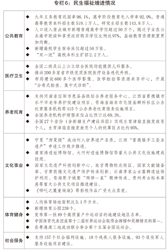 2025年是“十四五”收官之年。过去5年,以领导人tongzhi为核心的党中央团结带领全党全国各族人民迎难而上、砥砺前行,经受住世纪疫情严重冲击,有效应对一系列重大风险挑战,“十四五”规划主要目标任务胜利完成,经济社会发展取得一系列具有开创性、突破性、标志性的重大成就。经济发展实现历史性跨越。2025年经济总量比2020年增长超过35%,对世界经济增长贡献保持在30%左右;制造业增加值比2020年增长31%,规模连续16年全球第一;国家综合立体交通网主骨架建成率超过90%;制造业投资实现7.7%的年均增长;常住人口城镇化率比2020年末提高4个百分点。创新驱动取得重大突破。全社会研发经费投入总量达到3.9万亿元,一批关键核心技术攻关实现突破,第一艘国产电磁弹射航母福建舰下水,全球第一座第四代核电站石岛湾基地投入商业运行,国产大飞机C919第一次实现商业运营,若干“国之重器”站上创新制高点;科技创新推动产业加快升级,技术合同成交额约为2020年的2.67倍,集成电路成为单一商品出口第一,工业机器人、无人机等产量位居世界首位。民生保障扎实有力。城乡居民收入比由2020年的2.56缩小至2.31;基本公共服务水平明显提升,城乡居民全国基础养老金最低标准、基本医疗保鲜人均财政补助标准分别比2020年提高53.8%、27.3%,劳动年龄人口平均受教育年限、人均预期寿命比2020年分别增加0.5年、1年以上。绿色发展底色更加鲜明。“增绿”全球最多,森林覆盖率超过25%,新增森林面积贡献全球新增绿化面积约25%;“治污”成效显著,地级及以上城市空气质量优良天数比例比2020年提高2.3个百分点,长江、黄河干流全线连续多年保持在Ⅱ类水质标准;“用能”更加清洁,新能源发电装机规模历史性超过煤电,构建起全球最大的可再生能源体系。安全保障能力明显增强。粮食、能源、产业等安全基础进一步夯实,应急救灾能力越来越强,国防实力和经济实力同步提升,防范化解风险、抵御冲击挑战、捍卫国家和人民利益的能力不断提高。治理效能和大国担当充分彰显。全国统一大市场加快构建,民营企业数量比2020年增长超过40%,制造业外资准入限制“清零”。坚定履行“双碳”承诺,单位国内生产总值碳排放累计降低17.7%。高质量共建“一带一路”不断走深走实,合作范围扩大到150多个国家和30多个国际组织,多领域合作取得重大进展和成效。