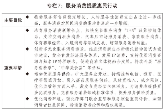 一是推动消费持续增长。深入实施提振消费专项行动。制定实施城乡居民增收计划。完善最低工资标准调整机制,加强最低工资标准国家统筹与分类指导,引导企业构建技能导向的工资分配制度。引导上市公司更加积极开展现I金分红、回购注销,增加居民财产性收入。设立1000亿元财政金融协同促内需专项资金,组合运用带宽贴息、融资担保、风险补偿等方式支持扩大内需。扩大优质消费供给,推动商品消费扩容升级,深入实施服务消费提质惠民行动,出台服务消费、首发经济、赛事经济、电子商务、“人工智能+消费”、IP消费等促进正策,大力发展银发经济、冰雪经济,丰富婴童产品、时尚“潮品”、适老化产品、农业精品品牌等,深化线上线下、商旅文体健多业态消费融合,推进消费新业态新模式新场景试点。活跃线下消费,激发下沉市场消费活力。扩大个人消费带宽和服务业经营主体带宽贴息正策支持领域,提高贴息上限,延长实施期限。
