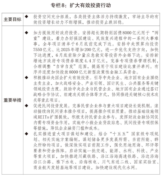二是投资补短板调结构加力增效。统筹用好各类资金支持重点项目建设,持续优化中央预算内投资结构,扩大地方正府专项债券投向领域和用作资本金范围,指导专项债券“自审自发”地区扎实有序开展相关工作。推动“十四五”规划102项重大工程项目顺利实现规划目标任务,开工建设雅下水电等标志性工程。现代化基础设施体系建设深入推进,国家综合立体交通网“6轴7廊8通道”加速完善。规范和加强中央投资项目审批管理,提高正府投资效益。出台进一步促进民间投资发展正策措施。滚动向民间资本推介5400多个项目,涉及总投资超过3.9万亿元。加大基础设施竞争性领域向各类经营主体公平开放力度,5个新核准核电项目引入民间资本参股比例最高达20%,大渡河丹巴水电站等项目加快引入民间资本。推动基础设施领域不动产投资信托基金(REITs)扩围扩容,算力设施、城镇供热、农贸市场、城市更新、专业仓库等领域实现“首单”发行。2025年工业投资、制造业投资分别增长2.6%、0.6%。