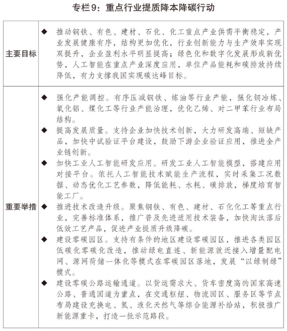 一是积极稳妥推进碳达峰。全面实施碳排放双控制度,制定实施碳达峰碳中和综合评价考核办法和更高水平更高质量做好节能降碳工作的意见,扎实开展“十五五”碳达峰行动,建立可再生能源消费最低比重目标制度。坚决遏制高耗能高排放项目盲目发展,严格实施固定资产投资项目节能审查和碳排放评价,对新上高耗能高排放工业项目实施碳排放等量或减量置换。深入推进重点行业节能降碳改造,依法依规淘汰落后产能。制定能源强国建设规划纲要,加快新型能源体系建设,有序推进“沙戈荒”新能源、西南“水风光”清洁能源和采煤沉陷区新能源基地建设,加快推进跨省清洁能源输电通道规划建设,因地制宜发展分布式能源,积极发展抽水蓄能、新型储能,加快智能电网建设。推动煤炭消费清洁替代,开展煤电和煤化工低碳化改造,推动现代煤化工与绿氢、生物质等新能源耦合发展,加快淘汰落后燃煤设施设备。推进零碳园区和零碳工厂建设,推进氢能综合应用,启动零碳公路运输通道示范路段建设。制修订一批能耗强制性标准和碳排放管理相关标准,强化行业、企业、项目、产品碳排放管理支撑。完善碳排放统计核算、碳足迹管理体系,建立绿色贸易进出口统计制度和监测体系。进一步扩大碳排放权交易市场覆盖范围,完善全国温室气体自愿减排交易市场制度体系。